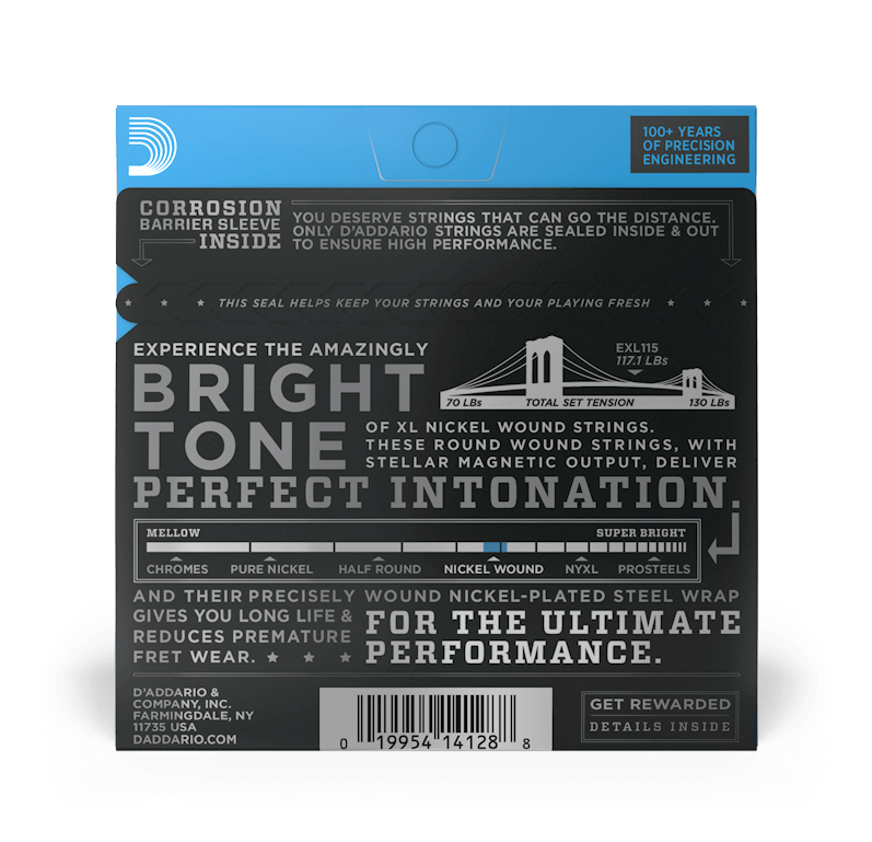 Struny D'Addario EXL115 posiadają niklowaną owijkę, która chroni je przed korozją tym samym przedłużając ich żywotność, nawiniętą na stalowy rdzeń o przekroju sześciokąta (heksagonalnym). Zestaw ten zapewnia długotrwałe, charakterystyczne jasne brzmienie, przeznaczone do każdego rodzaju muzyki.